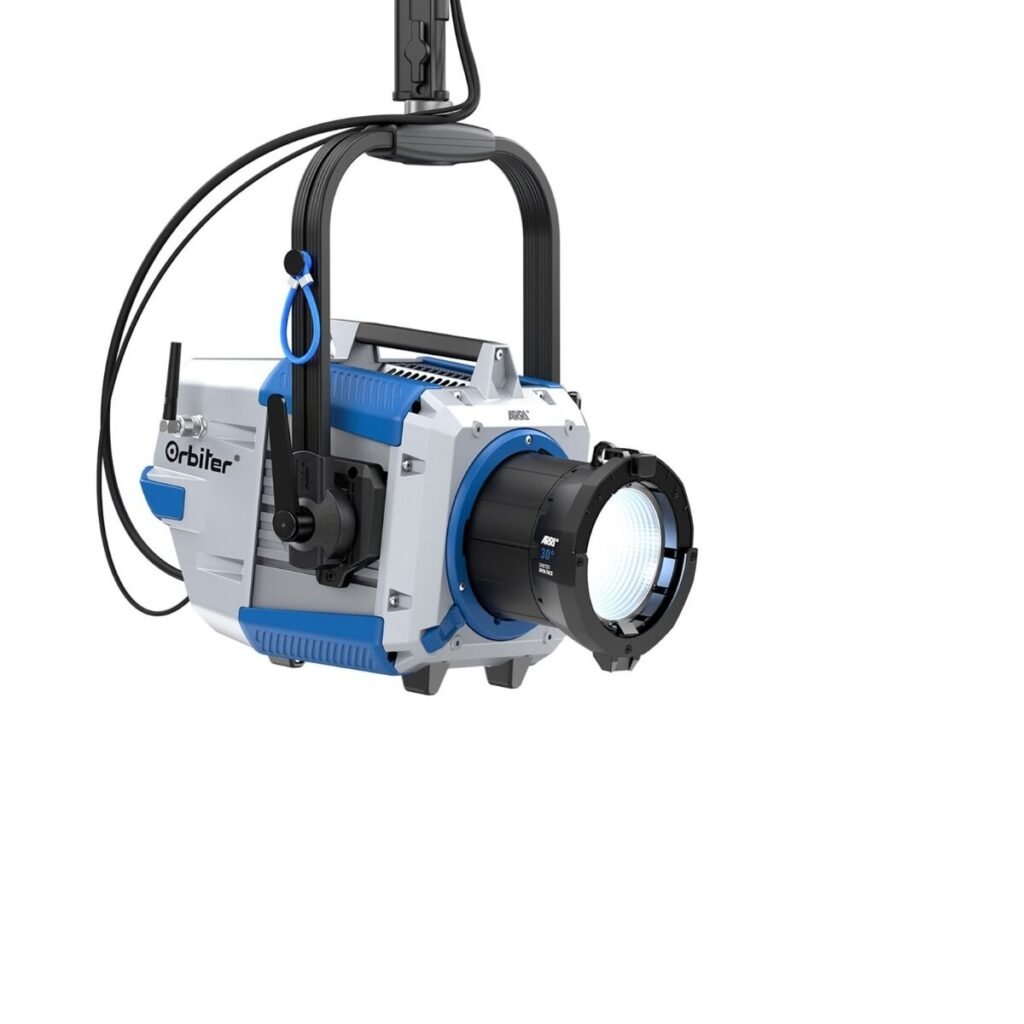 The ARRI Orbiter is an advanced LED point-source fixture with a wide color spectrum and interchangeable optics, designed for maximum flexibility and precision in professional film and television production.